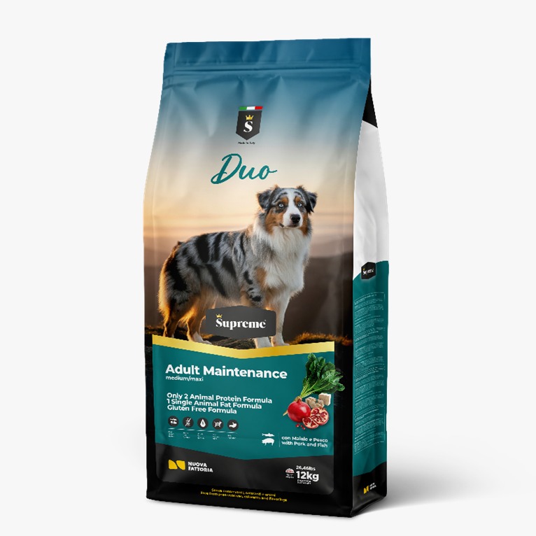 Alimento completo para perros adultos, formulado con dos fuentes de proteínas animales (con cerdo y pescado) y una sola fuente lipídica de origen animal. Disponible en envases de 3 kg y 12 kg.